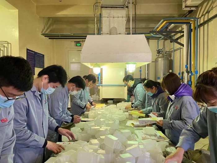 在聽取化工廠黨總支書記王金華、副廠長王云祥、安全總監(jiān)李川介紹產(chǎn)品、貼簽安全相關(guān)事項(xiàng)后??偛繄F(tuán)員青年們穿好工作服來到車間,經(jīng)過2小時(shí)的勞動(dòng),共貼簽6000個(gè),為企業(yè)生產(chǎn)貢獻(xiàn)一份綿薄之力。