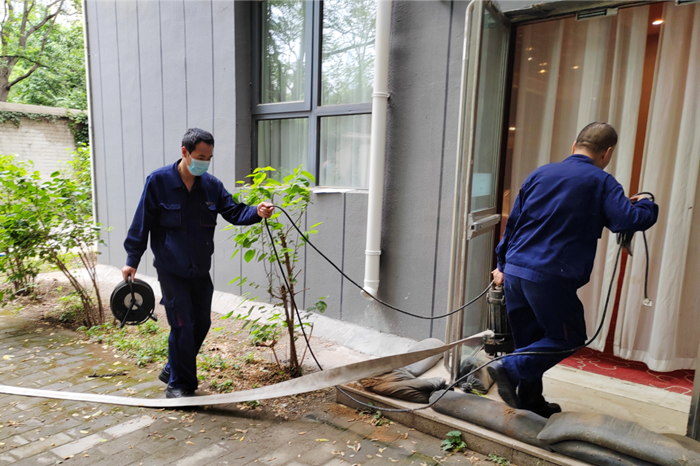 接到指令的工程部人員攜帶搶險(xiǎn)排澇設(shè)備:潛水泵、防水線軸、排水水帶趕到現(xiàn)場(chǎng),迅速開展排澇搶險(xiǎn)工作;接到搶險(xiǎn)指令的客房部人員攜帶吸水機(jī)、舊布草、拖把隨即到達(dá)現(xiàn)場(chǎng),對(duì)室內(nèi)殘存的積水進(jìn)行了處理。最終,在參與搶險(xiǎn)的各部門人員的通力合作下,“內(nèi)澇險(xiǎn)情”得到了有效控制,保護(hù)了酒店財(cái)產(chǎn)不受損失。此次演練圓滿成功,達(dá)到了預(yù)期效果。