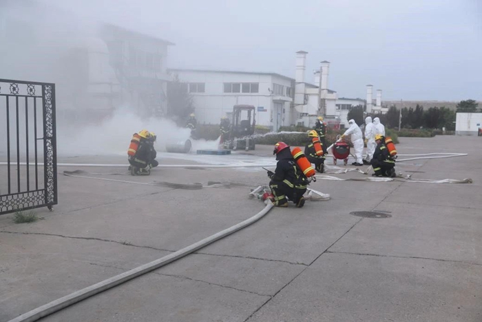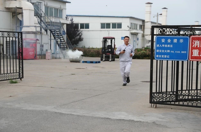 為進一步筑牢安全生產防線,壓緊壓實安全生產責任, 6月底,華騰化工組織開展了2024年危險化學品火災事故應急演練。此次演練模擬場景為危險化學品庫房入庫作業時發生丙酮泄露著火,開展了火災上報與先期處置、人員疏散逃生、微型消防站和消防救援隊滅火等環節的演練科目。