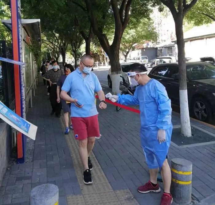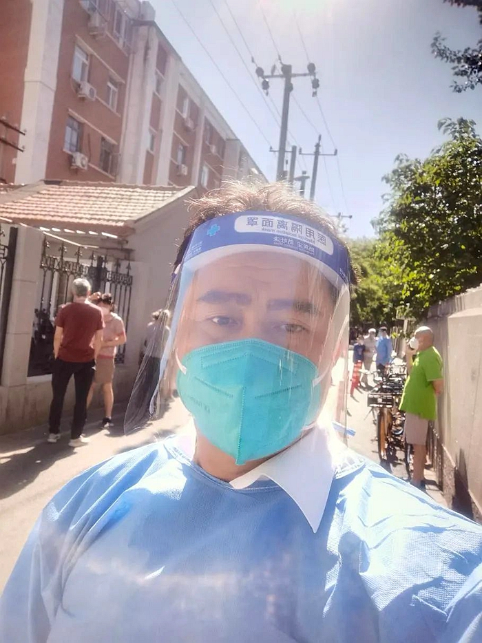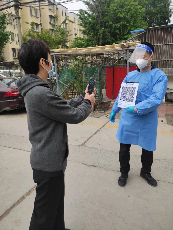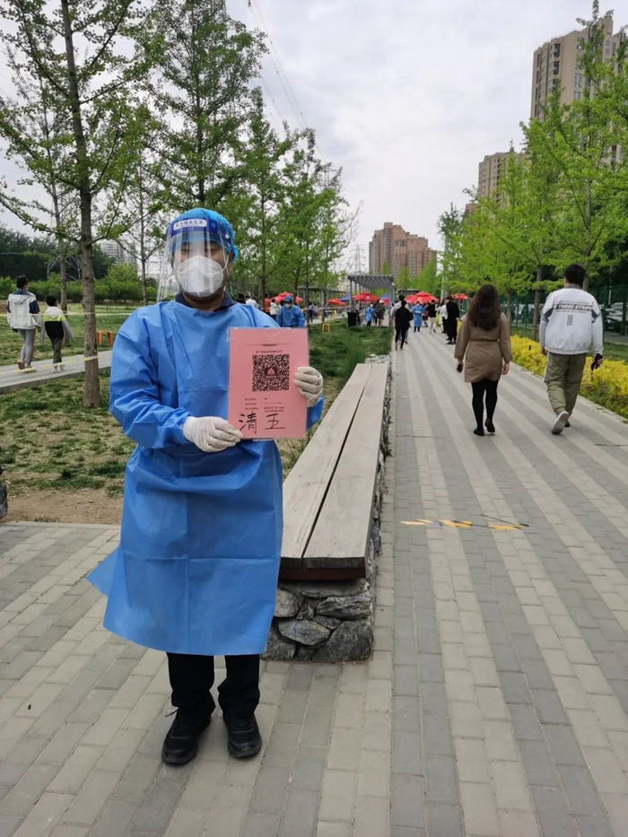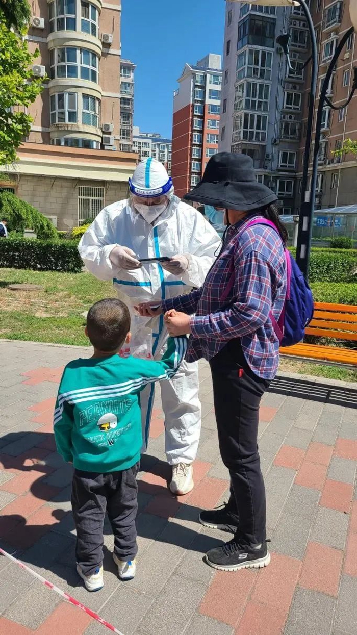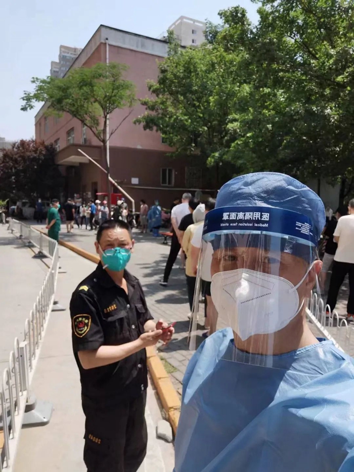 5月的天氣,溫度說升就升,每天2次4個小時的防護服穿下來,下崗時每每全身濕透,但我一點也不后悔,看著手機里每次錄入600人、700人、800人等的信息時,內(nèi)心升起一種無比的自豪,北京全員核酸檢測里有我的一份汗水。