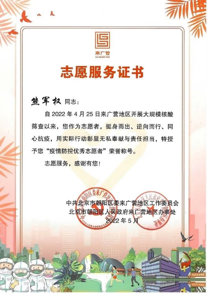 我真心地感謝北京化工集團、華騰東光公司領(lǐng)導(dǎo)給予了我這樣一次難得的、意義深遠的志愿服務(wù)機會,公司黨總支、工會還給我送來了慰問和溫暖。如果再有這樣的機會,我依然會積極去服務(wù),盡自己的努力為身邊的人做一些力所能及的事。我志愿,我快樂,請組織放心,請領(lǐng)導(dǎo)放心,為了北京的平安,為了社區(qū)的平安,作為國企職工,我一定堅持到底,戰(zhàn)斗到底,直到北京全面清零,共創(chuàng)我們的美好家園。
