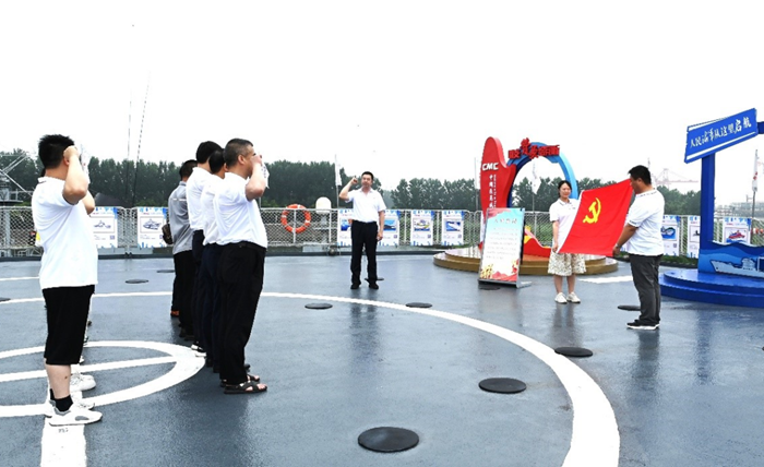 在“洪澤湖號補給艦”甲板層,全體黨員和入黨積極分子舉起右拳,面向黨旗莊嚴宣誓,誓為黨的事業奮斗終身。