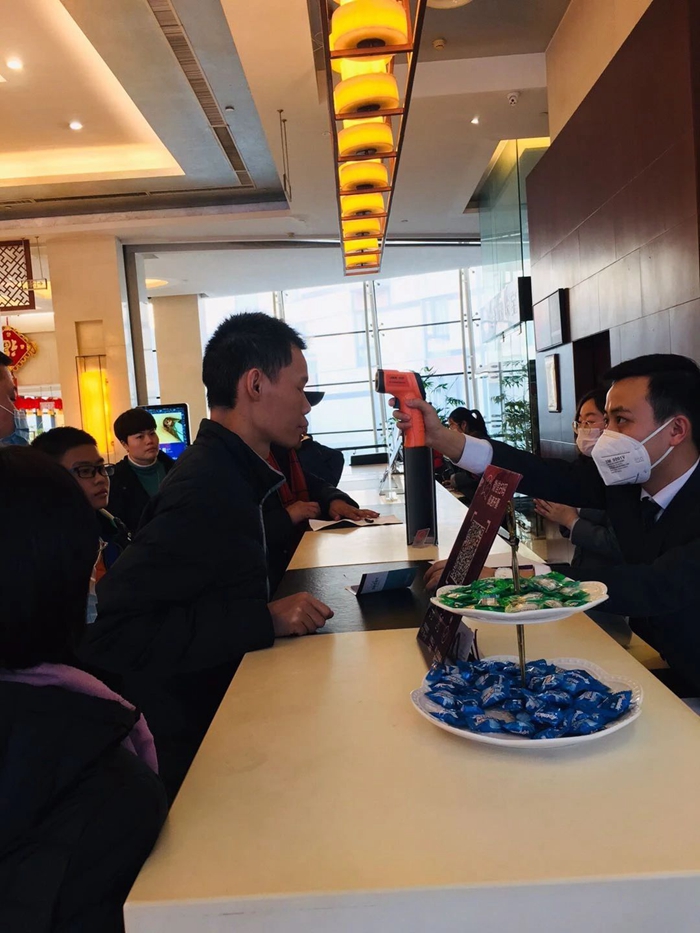 酒店對公共區域每一小時進行全面消毒并做好記錄,提高消毒消殺頻次,加大對客房區域消毒通風力度;同時在酒店大堂進出口設置賓客體溫檢測點。
