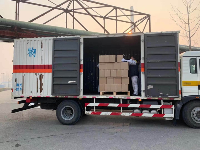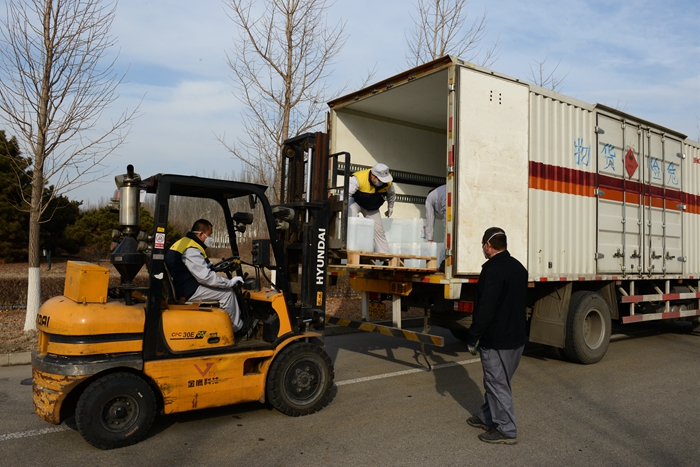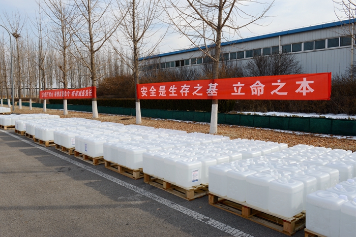 根據用戶反饋的需求信息,經市物資保障組決定,將25L大包裝調整為500ML/瓶小包裝,北化集團承擔相關卸貨、進庫、儲存、配送任務。由華騰化工公司倉儲事業部、安全生產部、保衛部、公用工程事業部20名同志負責卸貨入庫。