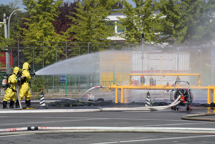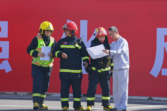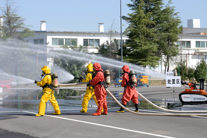 演練緊張而有序,周邊有毒有害氣體濃度監測和偵檢、事故現場火災撲救、空氣中可燃氣體和有毒有害氣體濃度稀釋、泄漏危險化學品輸送管道堵漏……環環相扣、環環跟進。